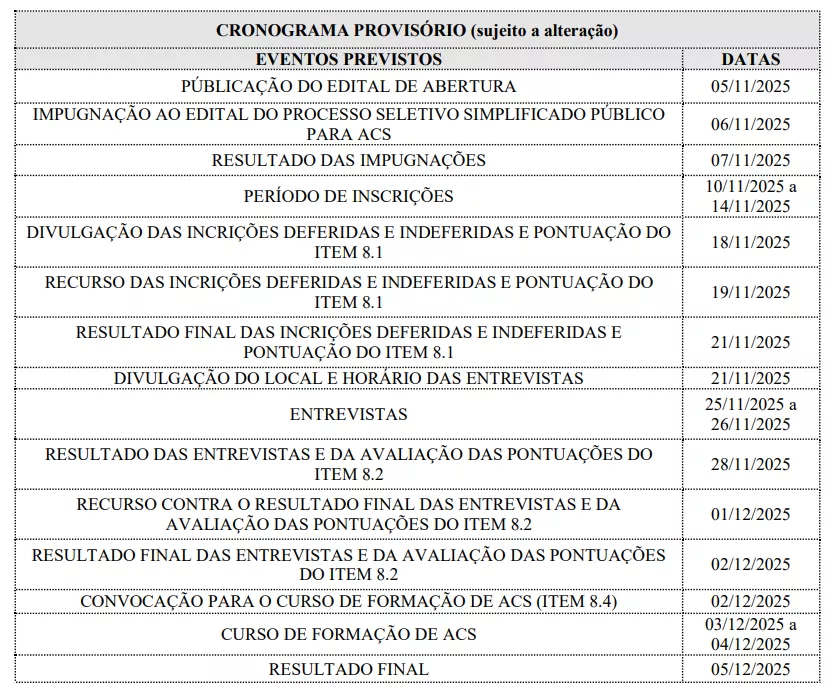 Entre os requisitos exigidos estão: idade mínima de 18 anos, ensino médio completo, comprovação de residência fixa há pelo menos um ano na área da UBS de atuação, além de aptidão física e mental para o cargo. O candidato também precisará concluir o Curso Introdutório de Formação de Agente Comunitário de Saúde, de caráter eliminatório.