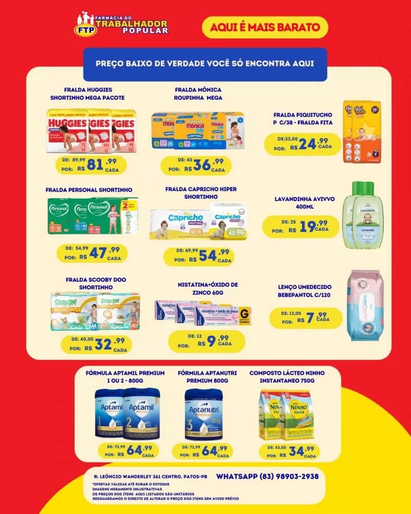 Entre os produtos em destaque estão fraldas, leites infantis, itens de higiene e muito mais, todos com a qualidade que as famílias patoenses já conhecem e confiam. A promoção reforça o compromisso da Farmácia do Trabalhador Popular em oferecer produtos essenciais para o cuidado e bem-estar das crianças com os menores preços da cidade.