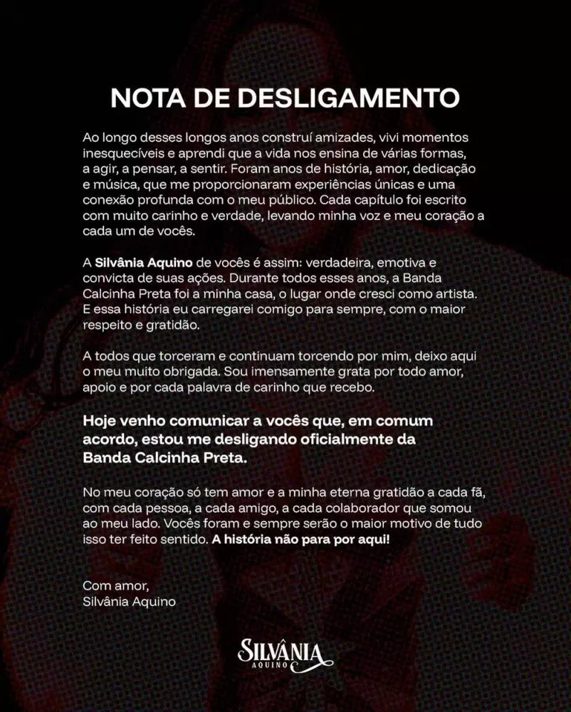 Na mensagem, Silvânia destacou sua história com a banda. "Ao longo desses longos anos construí amizades, vivi momentos inesquecíveis e aprendi que a vida nos ensina de várias formas, a agir, a pensar, a sentir. Foram anos de história, amor, dedicação e música, que me proporcionaram experiências únicas e uma conexão profunda com o meu público", escreveu.