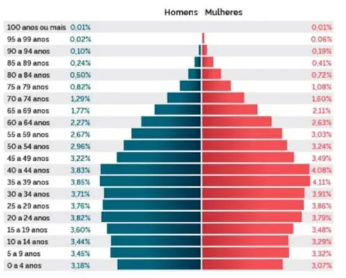 Se dividirmos a população brasileira em três grandes eixos etários, temos 42,06% nas faixas etárias mais jovens, formadas por pessoas de 0 a 29 anos; 42,11% entre 30 e 59 anos; e 15,83% com 60 anos ou mais. Esses dados demonstram que estamos em um processo de envelhecimento populacional, com consequente redução do número de pessoas economicamente ativas.