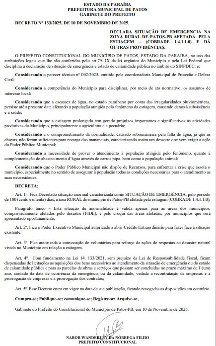 A Prefeitura Municipal de Patos decretou, na última segunda-feira (10), situação de emergência na zona rural do município em razão da estiagem prolongada que atinge a região. A medida, publicada por meio do Decreto nº 133/2025, tem validade de 180 dias e autoriza o Poder Executivo a adotar providências emergenciais para minimizar os impactos causados pela falta de chuvas.