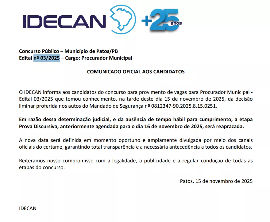 O Instituto de Desenvolvimento Educacional, Cultural e Assistencial Nacional (Idecan) anunciou, neste sábado (15), o adiamento da prova discursiva do concurso público para Procurador Municipal de Patos, regido pelo edital nº 03/2025, prevista para ocorrer neste domingo, 16 de novembro. A decisão ocorre após a instituição ser oficialmente comunicada de uma liminar concedida pela Justiça nos autos do Mandado de Segurança nº 0812347-90.2025.8.15.0251.