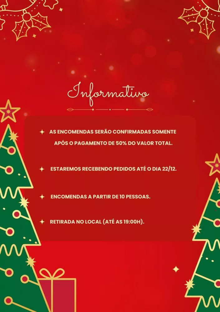 As encomendas serão aceitas a partir de 10 pessoas, e somente serão confirmadas após o pagamento de 50% do valor total no ato do agendamento. Os pedidos podem ser feitos até o dia 22 de dezembro, com retirada no local até às 19h.