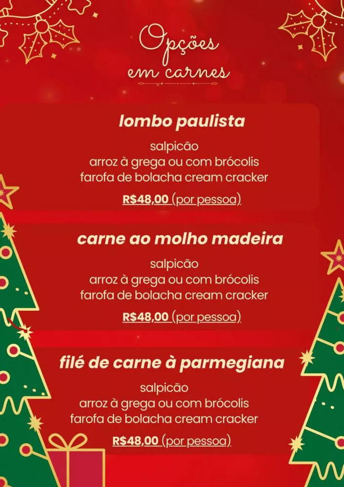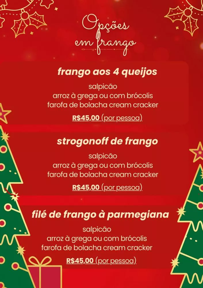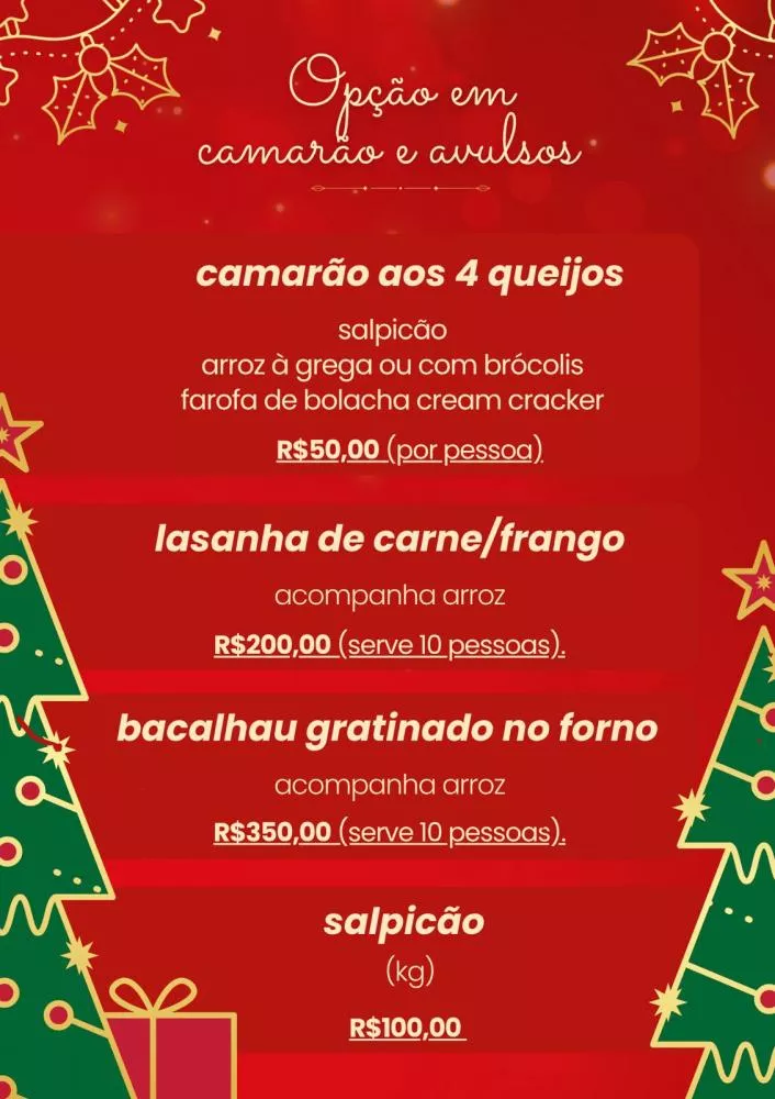 O cardápio reúne uma seleção especial de pratos que atendem a diferentes paladares. Entre os destaques está a lasanha, disponível nas versões carne e frango, que acompanha arroz e serve até 10 pessoas, sendo uma das opções mais procuradas para a ceia em família.