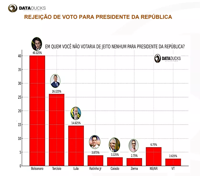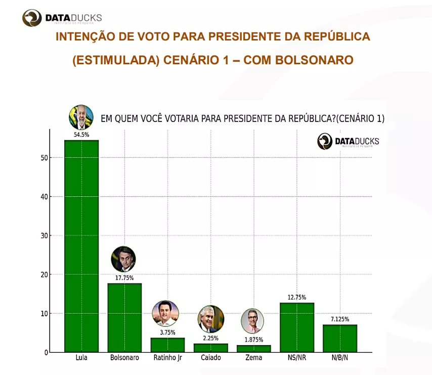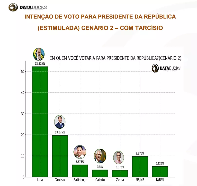 De acordo com o DataDucks, Lula foi confrontado, em cenários estimulados, com o governador de São Paulo, Tarcísio de Freitas, e com o ex-presidente Jair Bolsonaro, entre outros nomes da direita, vencendo com mais que o dobro do percentual obtido pelo segundo colocado. Confira os números: