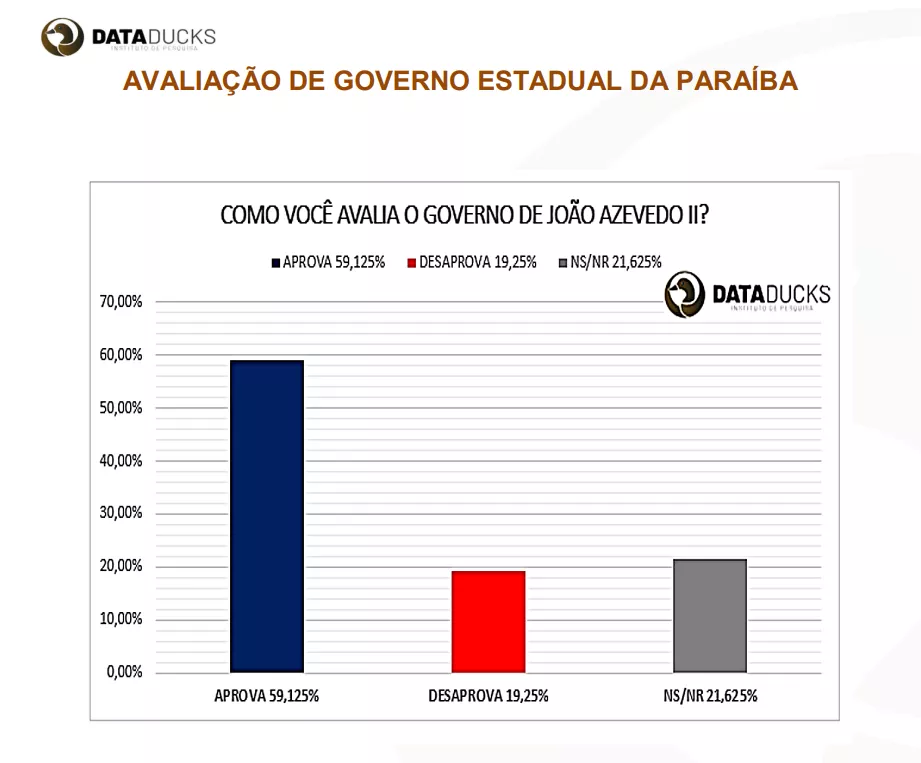 De acordo com o levantamento, a gestão atual da Paraíba foi aprovada por 59,12% dos eleitores entrevistados e desaprovada por 19,25%.