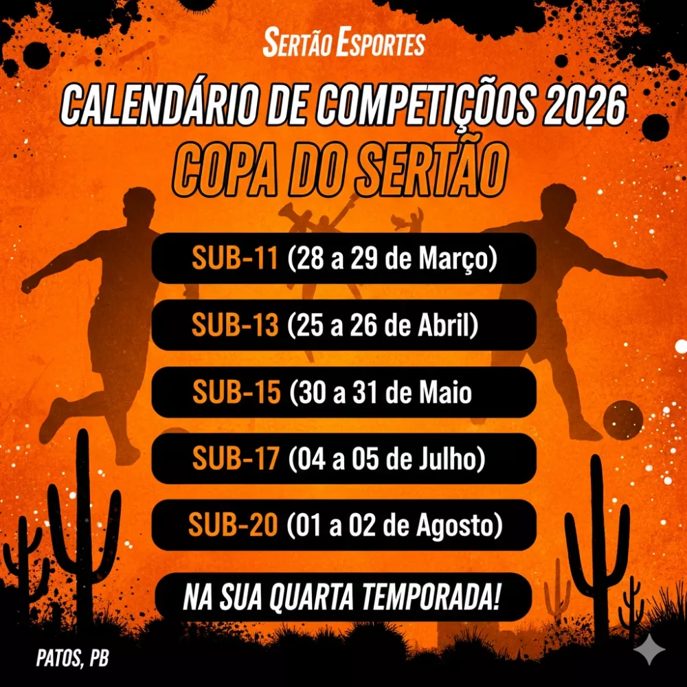 Em um cenário onde o futebol de base se torna cada vez mais crucial para o futuro do esporte nacional, o Circuito Sertanejo de Futebol de Base, popularmente conhecido como a Copa do Sertão, reafirma sua posição de protagonista. Com um sucesso estrondoso nas últimas três edições, a organização Sertão Esportes tem o orgulho de anunciar o lançamento do Calendário 2027 de suas competições de futebol de campo!