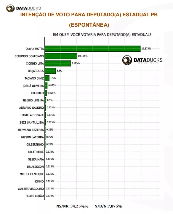 Pesquisa divulgada nesta terça-feira (25) pelo Instituto DataDucks, em parceria com o Patosonline.com, revelou uma disputa acirrada pela segunda colocação na preferência dos eleitores de Patos para deputado estadual. O levantamento mostra ampla liderança da médica Olívia Motta, que aparece com 29,87% das intenções de voto.