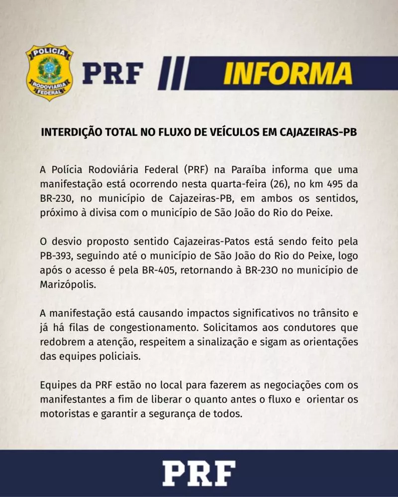 Para quem precisa seguir viagem no sentido Cajazeiras–Patos, o desvio está sendo realizado pela PB-393, passando por São João do Rio do Peixe. Em seguida, o acesso ocorre pela BR-405, com retorno à BR-230 no município de Marizópolis.