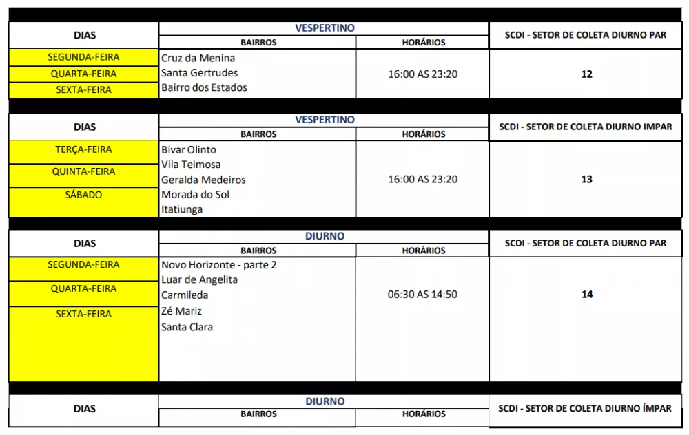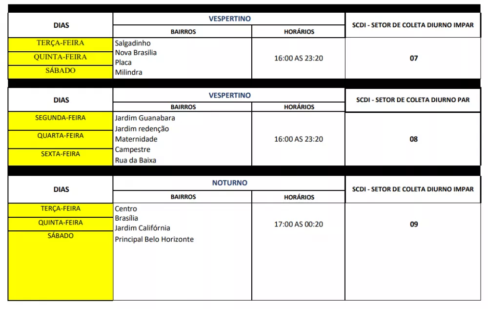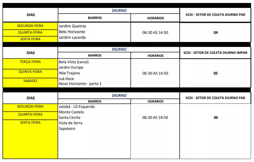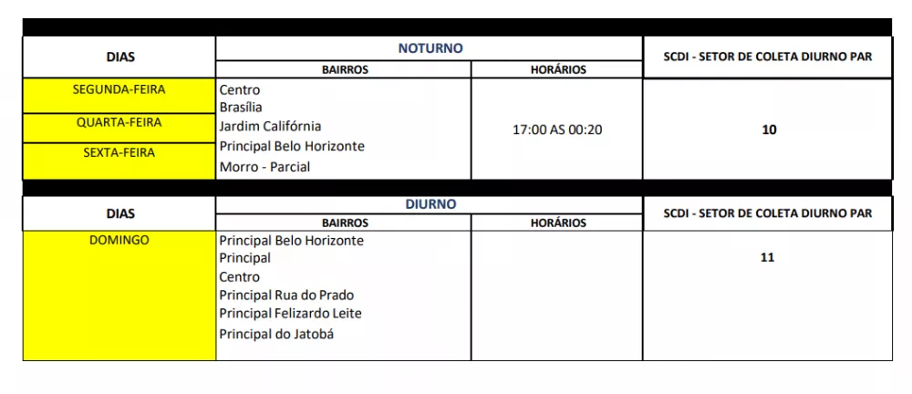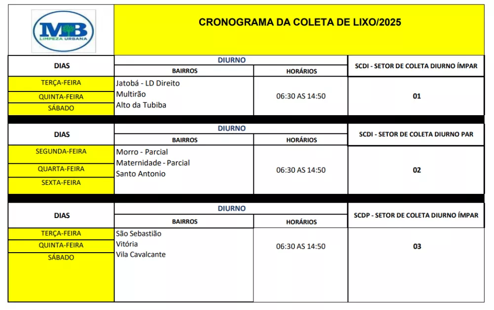 O novo esquema mantém a divisão por setores e turnos – diurno, vespertino e noturno – mas reorganiza os dias de coleta para bairros como Jatobá, Santo Antônio, São Sebastião, Jardim Queiroz, Bela Vista, Novo Horizonte, Centro e Brasília, entre outros, distribuídos entre dias pares e ímpares.