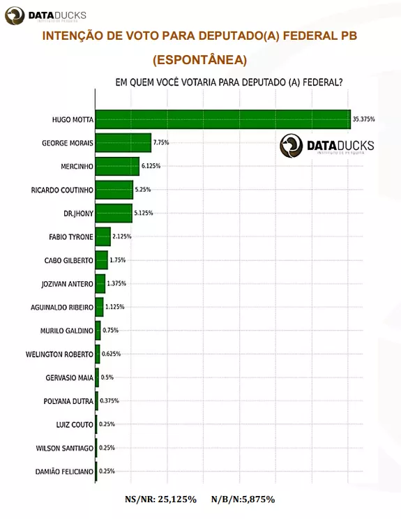 O presidente da Câmara, Hugo Motta (Republicanos), aparece em primeiro lugar na disputa pela Câmara Federal entre os 16 nomes citados na pesquisa do Instituto DataDucks realizada em novembro, no município de Patos. O parlamentar recebeu 35,37% da preferência do eleitorado patoense, sendo mencionado por 283 dos 800 entrevistados.