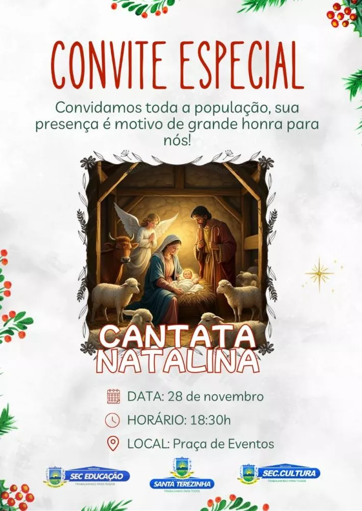 A Prefeitura Municipal de Santa Terezinha–PB, em parceria com a Secretaria Municipal de Educação, a Secretaria de Cultura, Esporte e Turismo e a Secretaria Municipal de Assistência Social, promoverá nesta sexta-feira (28) uma Cantata Natalina, às 18h30, na Praça de Eventos.