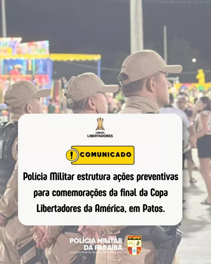 Libertadores Polícia Militar monta esquema especial de segurança para final da Libertadores em Patos e orienta que comemorações no Terreiro do Forró