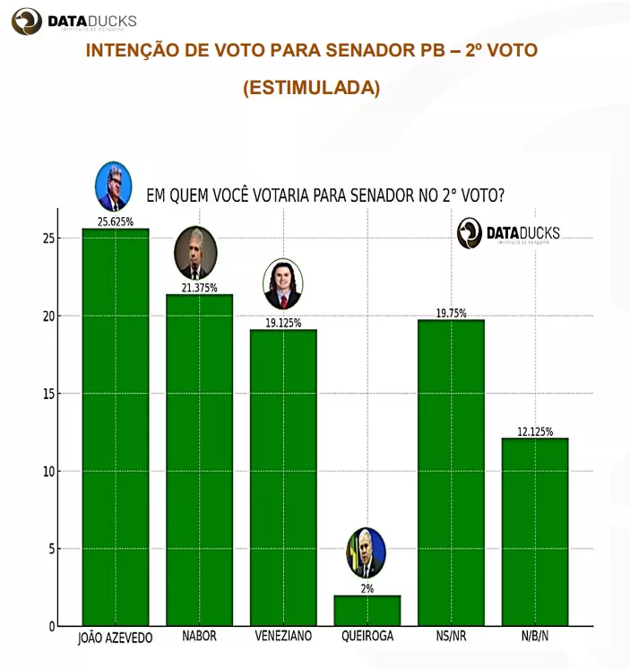 O senador e pré-candidato à reeleição, Veneziano Vital do Rêgo, recebeu 16,12% das intenções de voto, enquanto Marcelo Queiroga foi preferido por 0,87% dos entrevistados. Outros 8,25% dos eleitores responderam que votariam em branco, nulo ou em nenhum deles, e 14,25% se declararam indecisos.