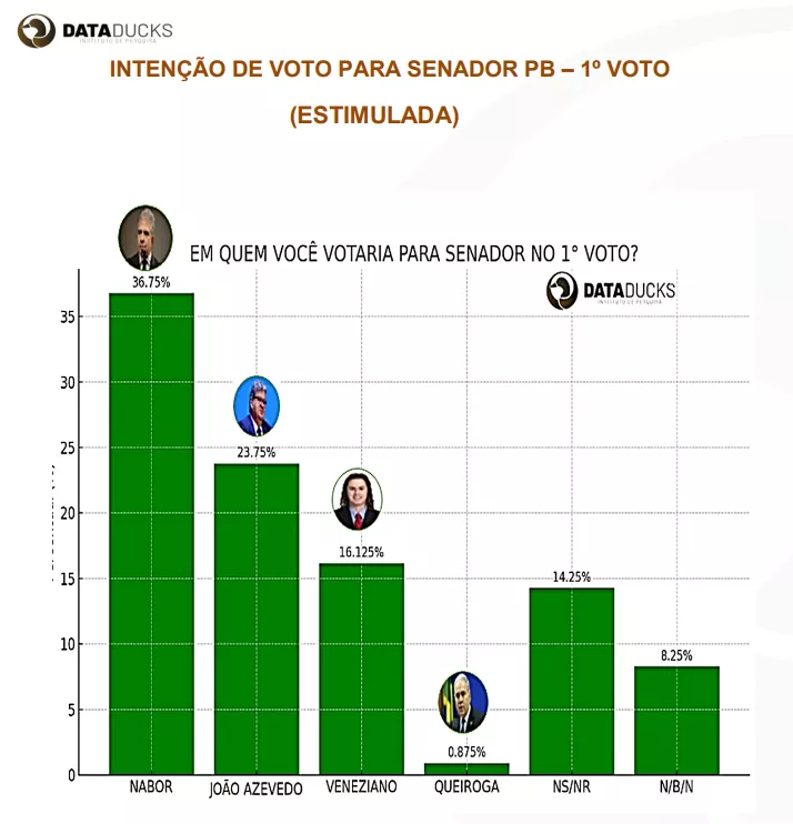 Na disputa pelo primeiro voto, Nabor recebeu 36,75% das intenções de voto dos 800 eleitores pesquisados, seguido por João Azevêdo, que foi preferido por 23,75% dos eleitores da Capital do Sertão.