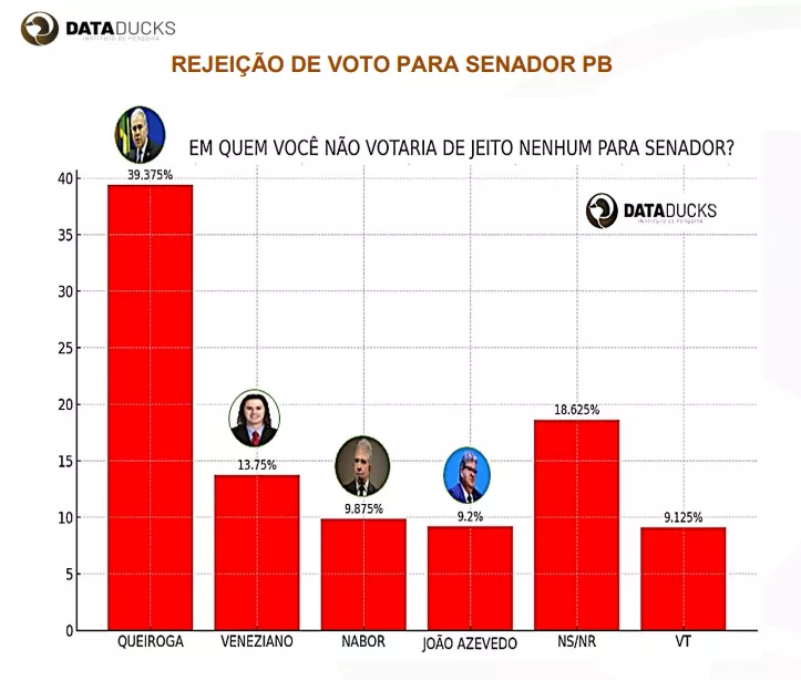 Questionados sobre em quem não votariam de jeito nenhum, 39,37% dos eleitores rejeitaram o nome de Marcelo Queiroga; 13,75%, o de Veneziano; 9,87%, o de Nabor; e 9,2% disseram rejeitar João Azevêdo. Outros 9,12% rejeitam todos os candidatos, e 18,62% não souberam ou não responderam.