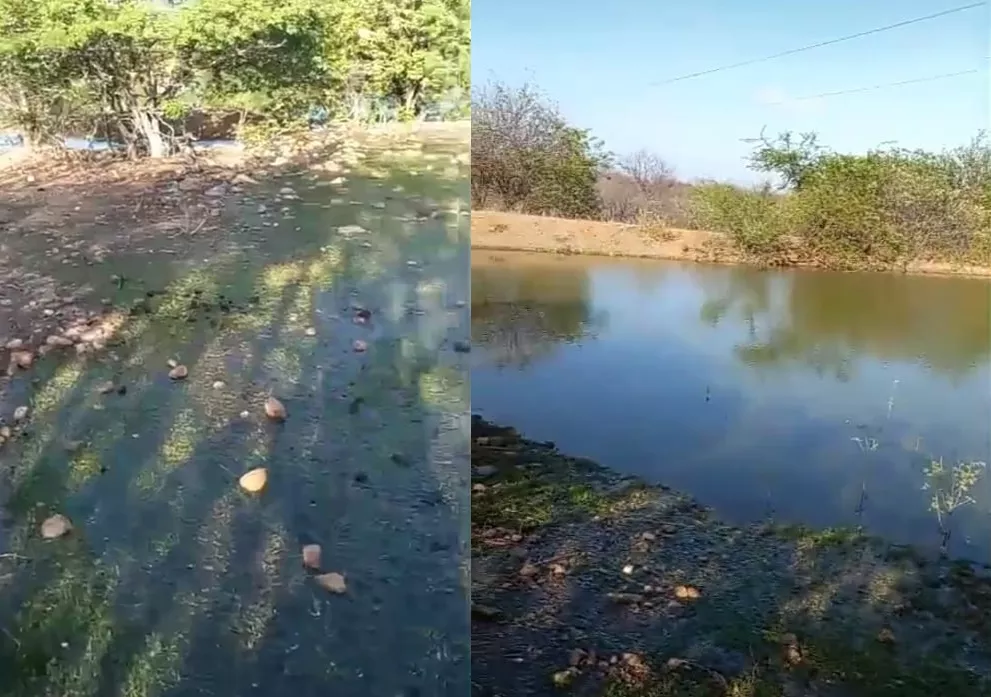 Nas imagens, é possível perceber a água formando córregos e descendo em direção às partes mais baixas do relevo, acumulando-se em um pequeno barreiro próximo à estação de captação e abastecimento do município.
