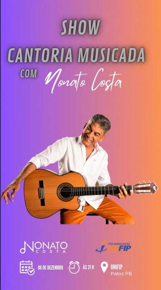 O Auditório Master da UNIFIP, em Patos/PB, será palco de um espetáculo especial neste sábado, 06 de dezembro. Em parceria com a Pós-Graduação da instituição, o poeta e cantador Nonato Costa apresenta o show “Cantoria Musicada”, uma performance acústica que une poesia, versos improvisados e muita musicalidade.