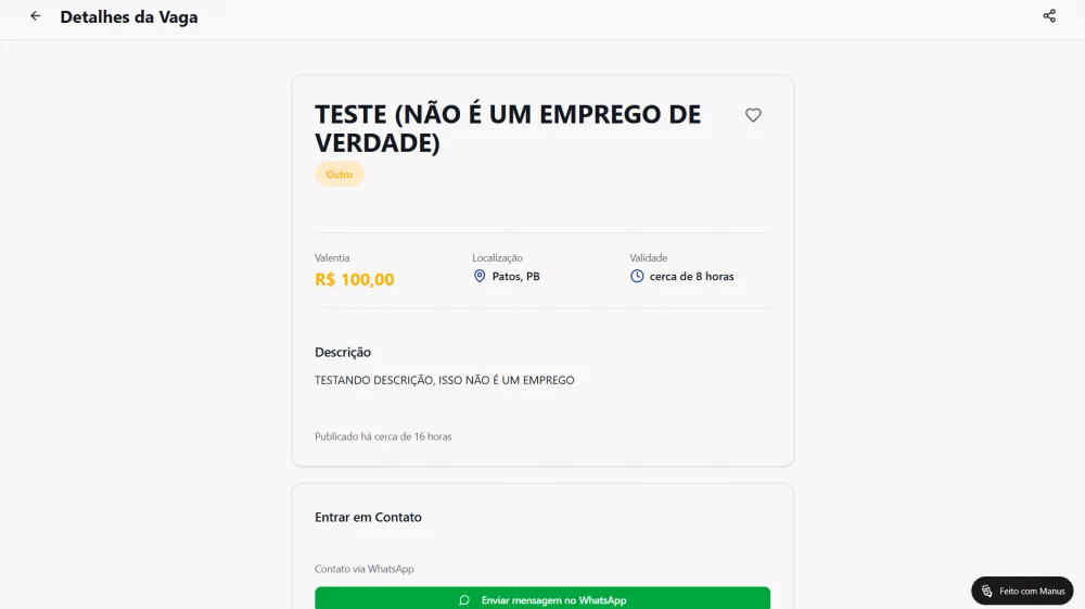 Uma iniciativa criada com foco em facilitar o acesso ao mercado de trabalho em Patos vem ganhando destaque nas redes sociais. O jovem Landin, de 18 anos, desenvolveu um site totalmente gratuito voltado exclusivamente para a divulgação de vagas de emprego na cidade, com o objetivo de tornar mais prática a conexão entre quem oferece e quem procura trabalho.