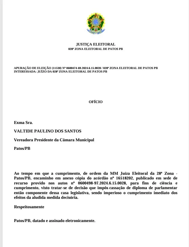 A decisão foi formalizada após a presidente da Câmara Municipal de Patos, Tide Eduardo, ser oficiada na manhã desta quarta-feira pelo Tribunal Regional Eleitoral da Paraíba (TRE-PB), que determinou o afastamento de Josmá em cumprimento à decisão que cassou seu mandato na última quinta-feira (4). No mesmo julgamento, a Corte também determinou a anulação dos votos da chapa do MDB por fraude à cota de gênero nas eleições de 2024.