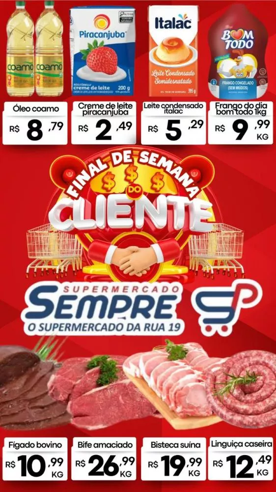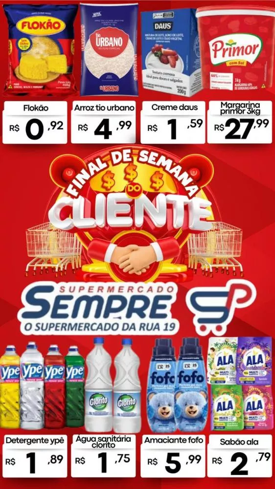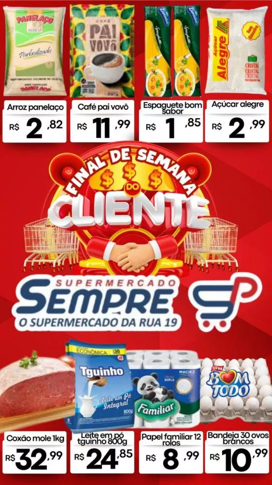 O Supermercado Sempre deu início ao aguardado Final de Semana do Cliente, trazendo uma seleção especial de ofertas para quem busca economia de verdade. Conhecido por praticar os menores preços da cidade, o supermercado reforça mais uma vez seu compromisso com o bolso do consumidor, oferecendo produtos de qualidade com valores acessíveis.
