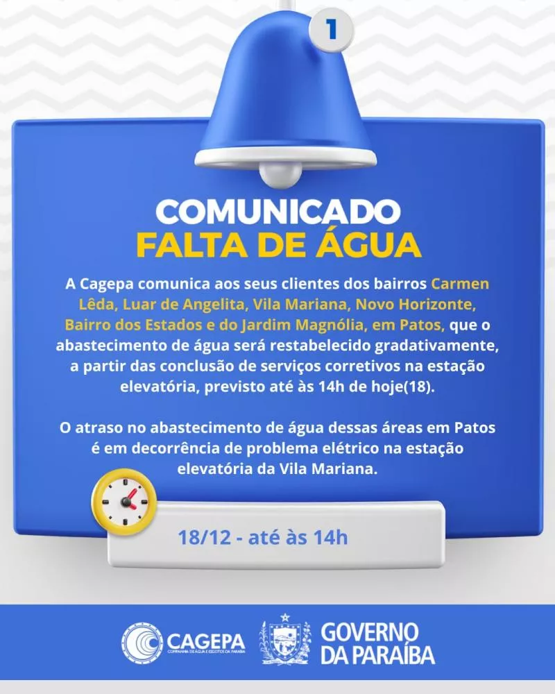 A Companhia de Água e Esgotos da Paraíba (Cagepa) informou, por meio de comunicado, que o abastecimento de água em vários bairros de Patos será restabelecido de forma gradativa a partir das 14h desta quinta-feira (18), após a conclusão de serviços corretivos.