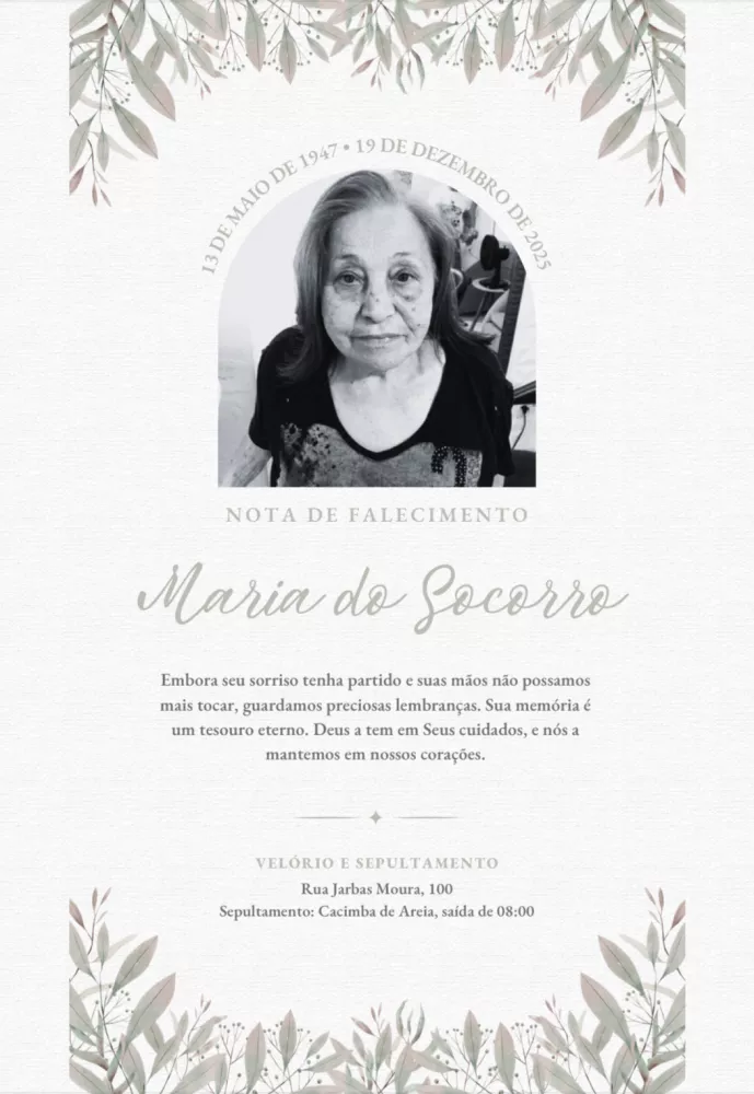 Segundo a família, Maria do Socorro morreu de causas naturais em decorrência de falência renal. Viúva, ela deixa três filhos e uma história marcada pelo trabalho, dedicação e carinho com todos que conviveram com ela ao longo da vida profissional e pessoal.