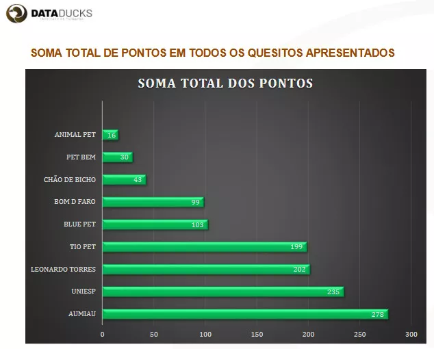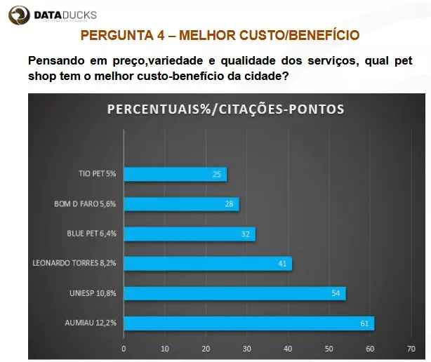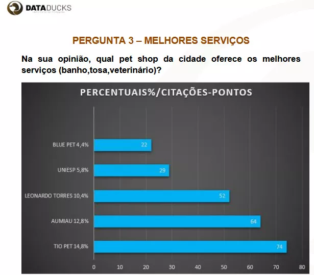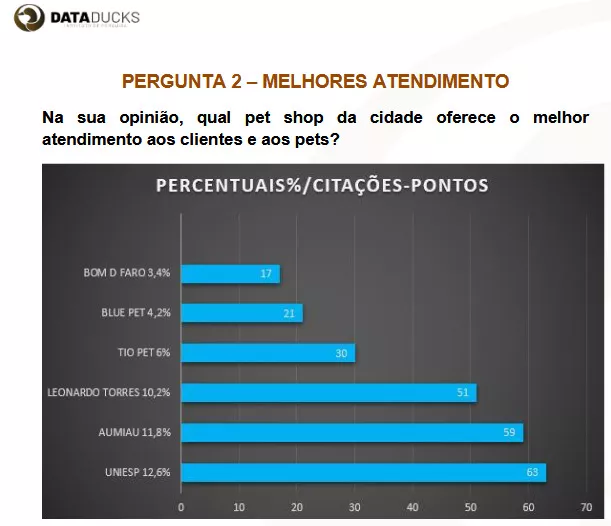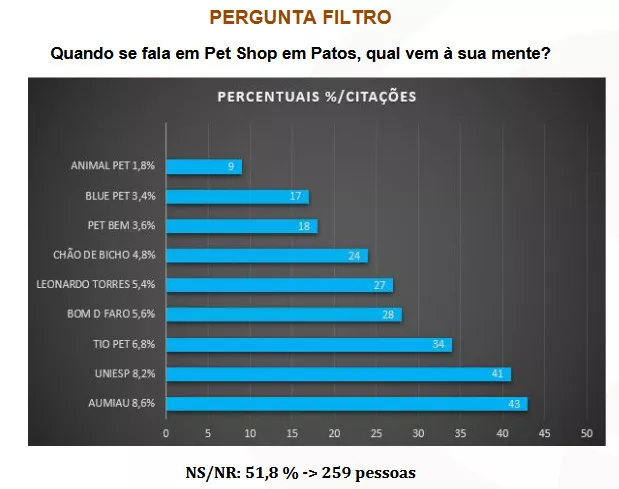 O estudo levou em consideração respostas espontâneas dos entrevistados, refletindo a experiência direta dos consumidores que utilizam serviços como banho e tosa, clínica veterinária, comercialização de rações, medicamentos e acessórios para pets. A distribuição da amostra em diferentes regiões da cidade garantiu maior representatividade dos resultados, contemplando variados perfis de moradores.