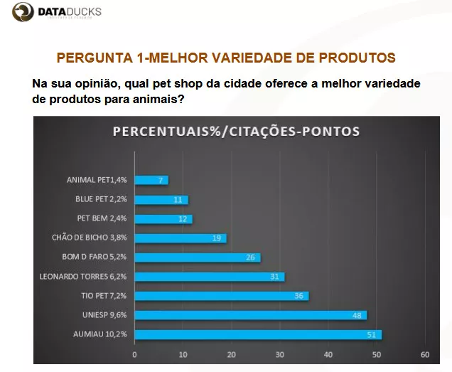 De acordo com a pesquisa, o Pet Shop AUMIAU foi apontado como o melhor pet shop de Patos. O estabelecimento se destacou, principalmente, pela qualidade no atendimento, diversidade de produtos, serviços oferecidos e pela confiança conquistada junto aos clientes ao longo do tempo.