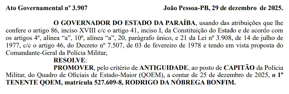 Entre os oficiais promovidos está o 1º Tenente Rodrigo da Nóbrega Bonfim, que ascendeu ao posto de Capitão pelo critério de antiguidade. Atualmente, o oficial comanda a 4ª Companhia do 3º Batalhão da Polícia Militar, com sede no município de Teixeira, no Sertão paraibano.