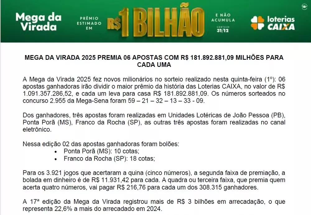 Depois de ser adiado, o sorteio da Mega da Virada 2025 foi realizado pela Caixa Econômica Federal na manhã desta quinta-feira (1º). O concurso 2.955 já fez história ao pagar o maior prêmio: R$ 1.091.357.286,52. As seis dezenas são: 59 - 21 - 32 - 13 - 33 - 09. Seis apostas vão dividir o prêmio principal, e cada uma vai ficar com R$ 181.892.881,09.