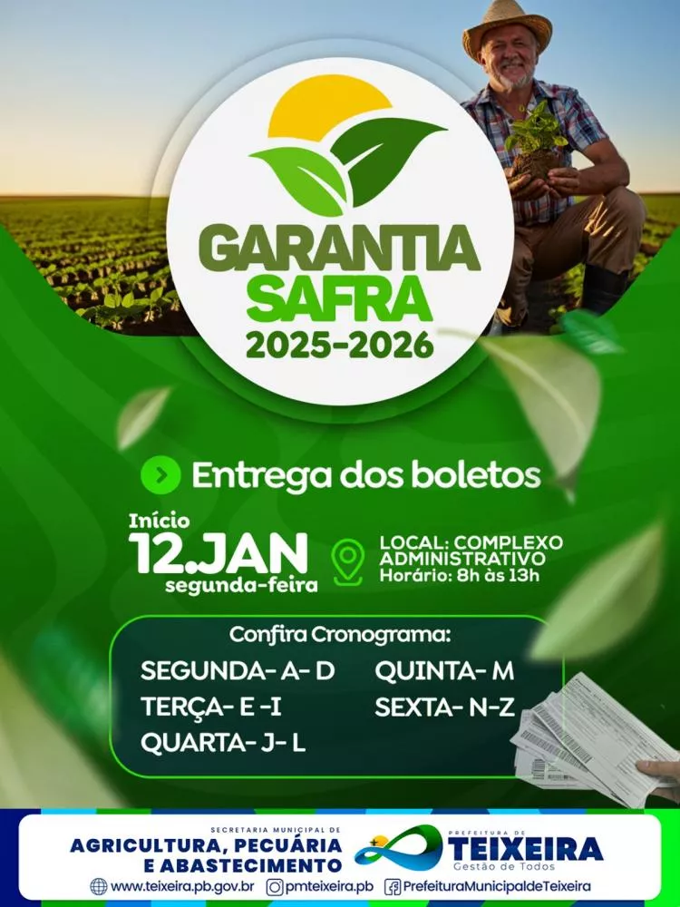 A Prefeitura de Teixeira, por meio da Secretaria Municipal de Agricultura, Pecuária e Abastecimento, informa que terá início na próxima segunda-feira, 12 de janeiro, a entrega dos boletos do programa Garantia-Safra 2025/2026.