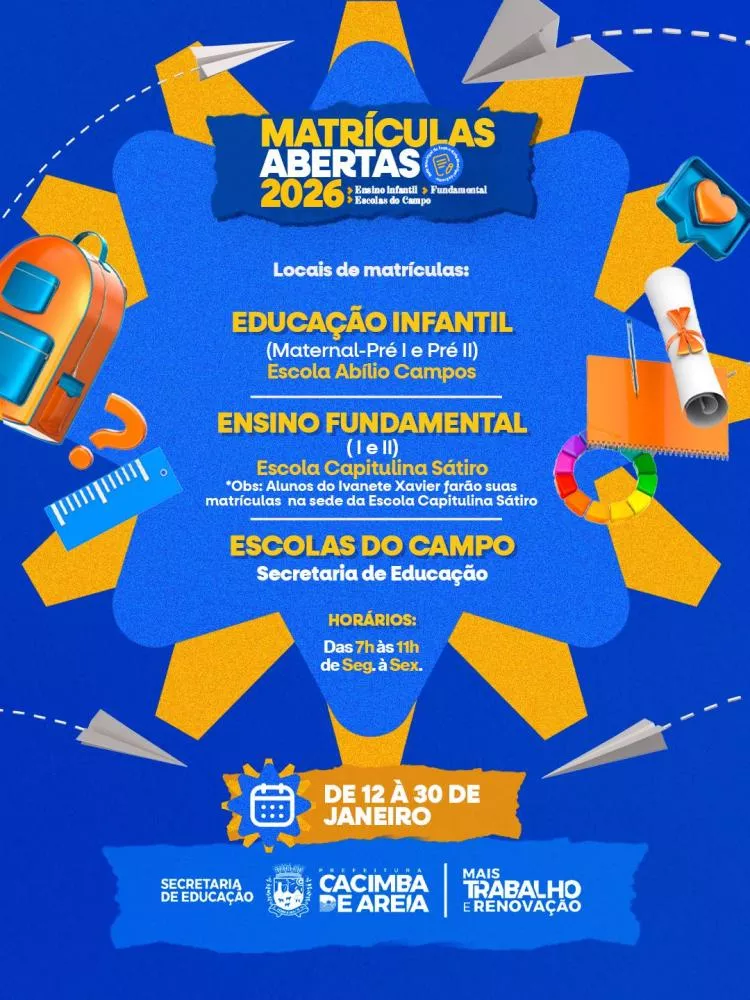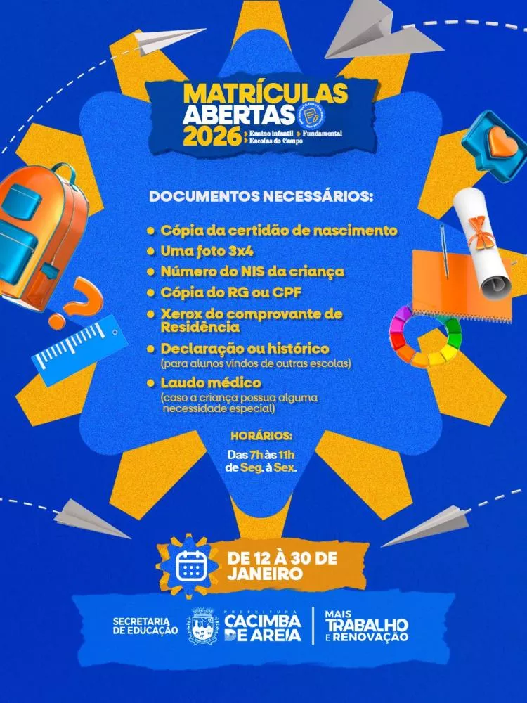 A Prefeitura de Cacimba de Areia, por meio da Secretaria Municipal de Educação, anunciou a abertura das matrículas para o ano letivo de 2026 na rede municipal de ensino. O período terá início na próxima segunda-feira, 12 de janeiro, e seguirá até 30 de janeiro, conforme calendário definido pela pasta.
