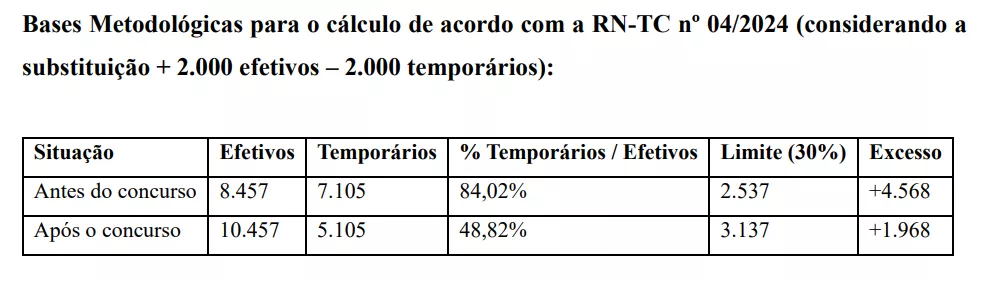 Dados constantes no Relatório de Análise de Defesa do Processo nº 04.874/25, do TCE-PB, indicam que, em agosto de 2025, a rede estadual possuía 15.562 professores, sendo 8.457 efetivos e 7.105 temporários. De acordo com a Resolução Normativa nº 04/2024 do TCE, o percentual de temporários não deve ultrapassar 30% do número de efetivos. No entanto, o índice atual chega a 84,02%. Mesmo com a nomeação de 2 mil novos professores efetivos, o percentual ainda permaneceria acima do limite legal.