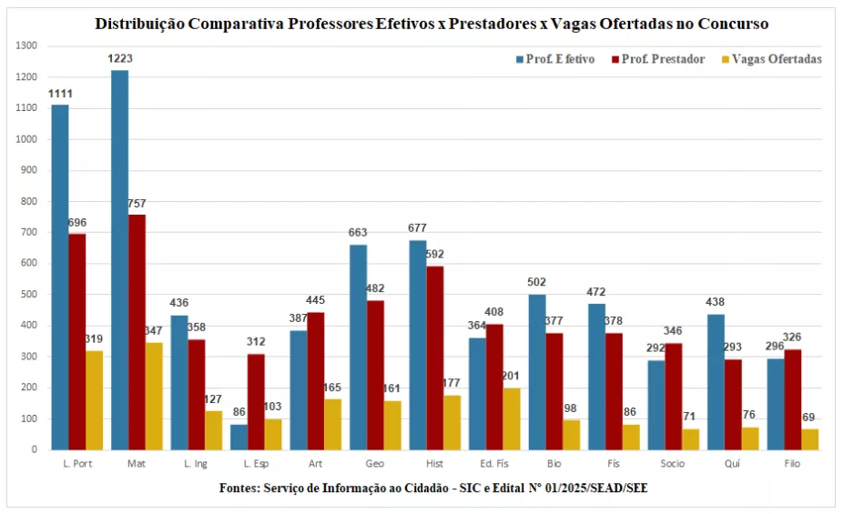 Levantamentos apresentados pela comissão mostram que, em janeiro de 2016, a rede estadual contava com 14.258 servidores efetivos ativos. Em abril de 2025, esse número caiu para 10.293, enquanto o volume de contratos temporários permaneceu elevado.