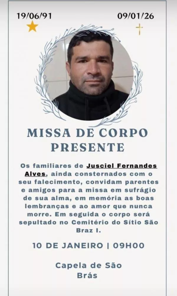 O Portal Patos Online manifesta profundo pesar pelo falecimento de Jusciel Fernandes Alves e se solidariza com familiares e amigos neste momento de dor, desejando conforto e força a todos.
