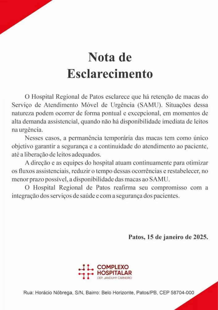 Em nota de esclarecimento enviada ao Patos Online, o Hospital Regional de Patos informou que a retenção de macas do SAMU pode ocorrer de forma pontual e excepcional, especialmente em períodos de alta demanda assistencial, quando não há disponibilidade imediata de leitos na urgência.