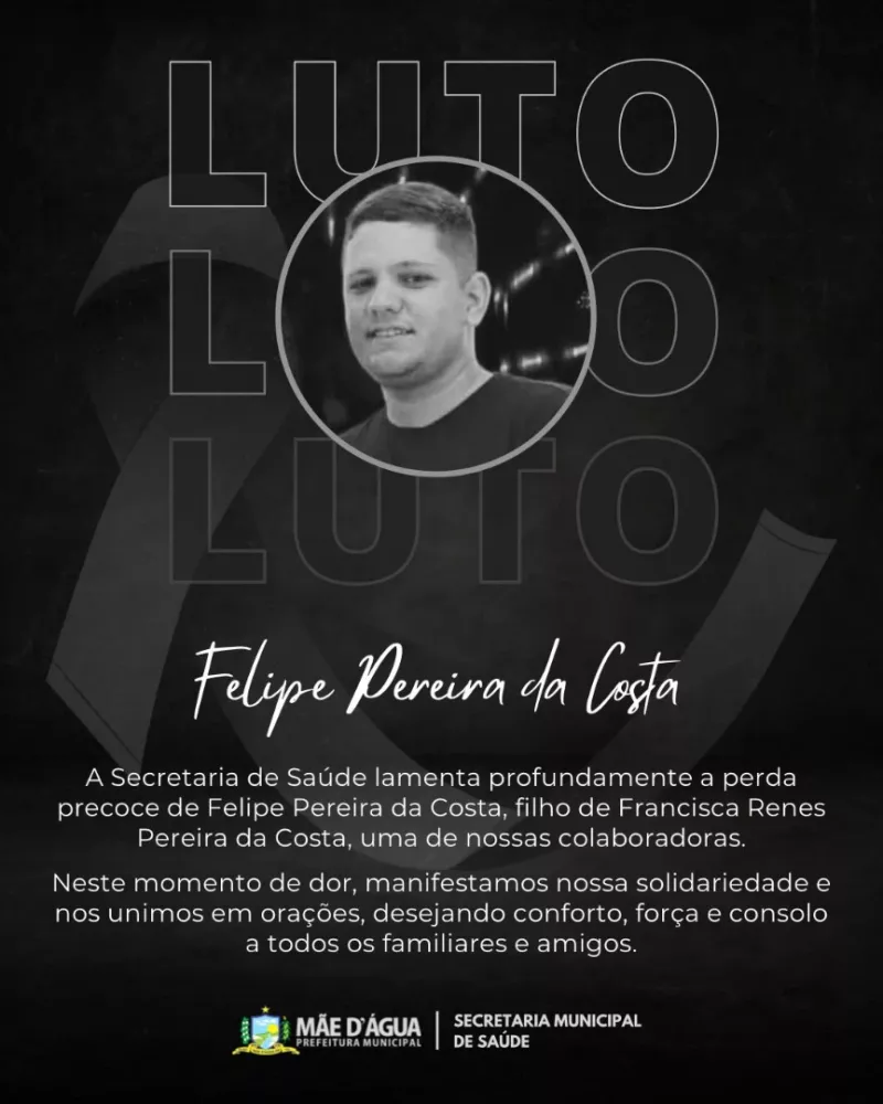 “A Secretaria de Saúde lamenta profundamente a perda precoce de Felipe Pereira da Costa, filho de Francisca Renes Pereira da Costa, uma de nossas colaboradoras.