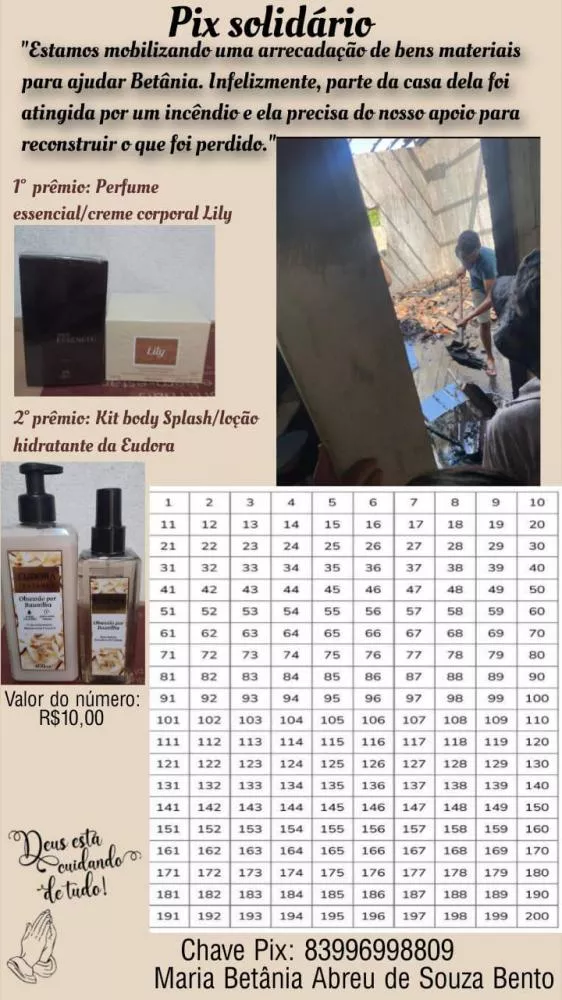Além disso, uma rifa solidária também está sendo realizada. Os interessados em ajudar podem entrar em contato pelo telefone: (83) 99699-8809.