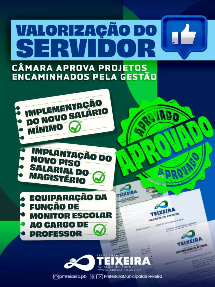 A aprovação das iniciativas demonstra o respeito da administração municipal com o funcionalismo público, ao reconhecer que investir em quem trabalha diariamente pelo município é fundamental para assegurar serviços cada vez mais qualificados à população teixeirense.