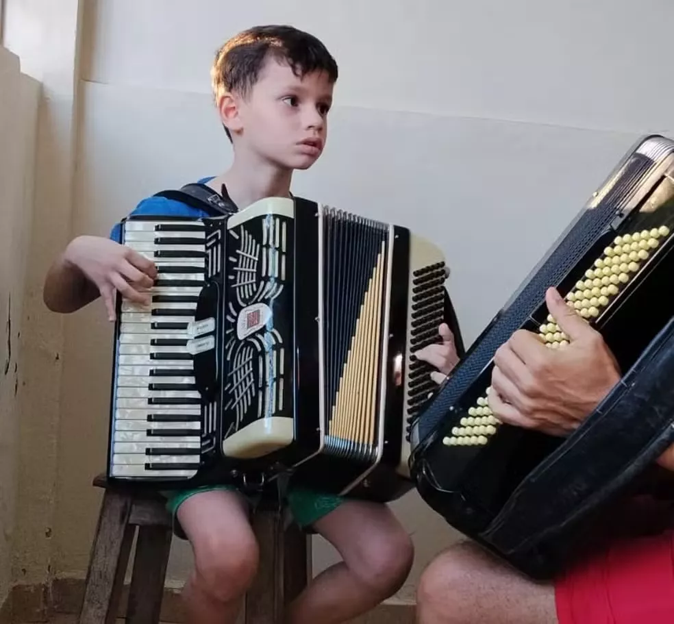 "Gabriel se encantou, saiu de lá chorando porque queria um triângulo. Chegou em casa, pediu a meu pai, que é o avô dele. Aí o pai foi e mandou fazer um triângulo pra ele. E ele era com esse triângulo na mão direto, direto (...) Em 2024 eu levei Gabriel pela primeira vez pra o São João aqui de Sumé, e ele subiu no palco e ficou encantado olhando os outros instrumentos. E daí ele começou a pedir uma sanfona", explicou a mãe de Gabriel, Marília.