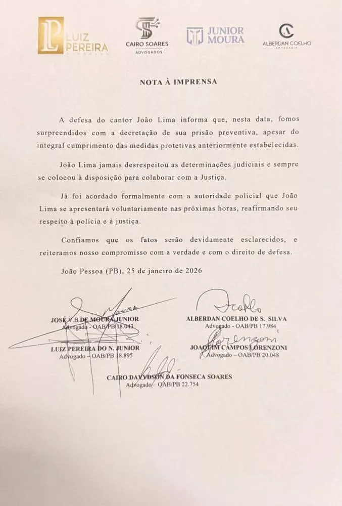 A defesa do cantor paraibano João Lima divulgou, na noite deste domingo (25), uma nota à imprensa afirmando ter sido surpreendida com a decretação da prisão preventiva do artista, determinada pelo Plantão Judiciário do Tribunal de Justiça da Paraíba (TJPB). A decisão foi assinada pelo juízo plantonista após representação do Ministério Público da Paraíba.