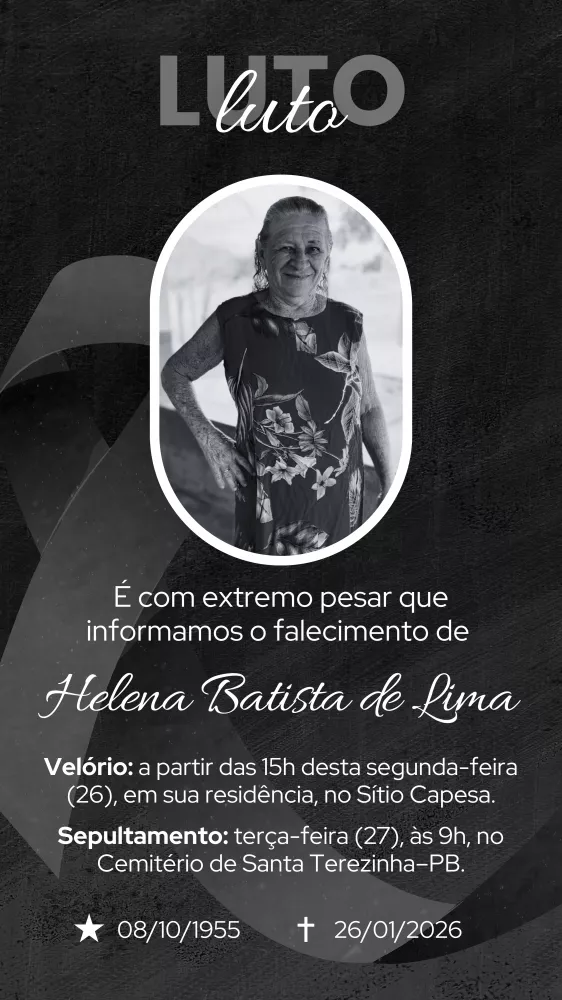 Com pesar, familiares comunicam o falecimento da senhora Helena Batista de Lima, de 70 anos, ocorrido na madrugada desta segunda-feira (26), no Hospital da FAP, em Campina Grande. Ela estava em tratamento contra um câncer.