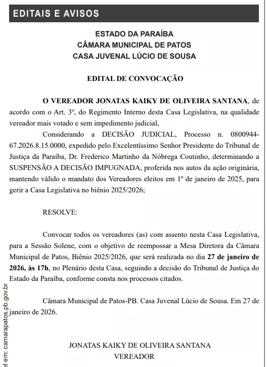 A convocação tem como base decisão judicial proferida no processo nº 0800944-67.2026.8.15.0000, assinada pelo presidente do Tribunal de Justiça da Paraíba (TJPB), desembargador Frederico Martinho da Nóbrega Coutinho, que suspendeu os efeitos da liminar anteriormente concedida pela 4ª Vara Mista de Patos. Com isso, foi mantida a validade do mandato dos vereadores eleitos em 1º de janeiro de 2025 para conduzir a Mesa Diretora no atual biênio.