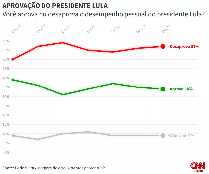A reprovação cresceu 7 pontos percentuais em quase dois anos: em março de 2024, 50% desaprovavam o presidente. Já a aprovação, caiu 5 pontos percentuais. Naquela época, o petista era aprovado por 39% dos eleitores.