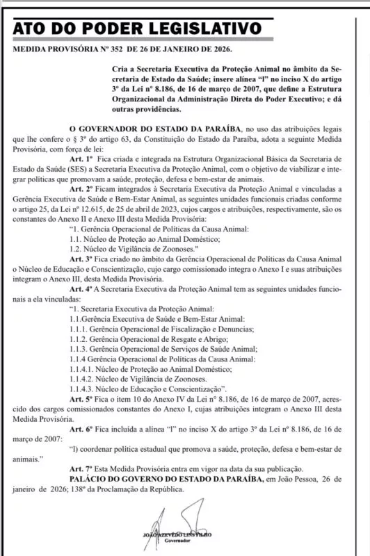 O governador da Paraíba, João Azevêdo, oficializou a criação da Secretaria Executiva da Proteção Animal do Estado, por meio da Medida Provisória nº 352, publicada no Diário Oficial. O novo órgão passa a integrar a estrutura organizacional da Secretaria de Estado da Saúde (SES).