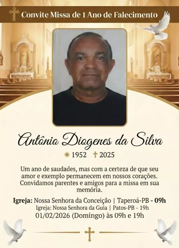 Os familiares do oficial de Justiça Antônio Diogenes da Silva, conhecido carinhosamente como Toinho, convidam parentes, amigos e a comunidade em geral para a missa de 1 ano em sua memória, que será celebrada no próximo domingo, dia 1º de fevereiro.