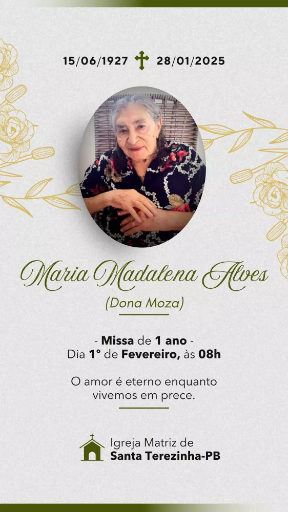 Os familiares de Maria Madalena Alves, carinhosamente conhecida como “Dona Moza”, convidam parentes e amigos para a missa de 1 ano em sua memória, que será celebrada neste domingo, 1º de fevereiro, às 8h, na Igreja Matriz de Santa Terezinha-PB.