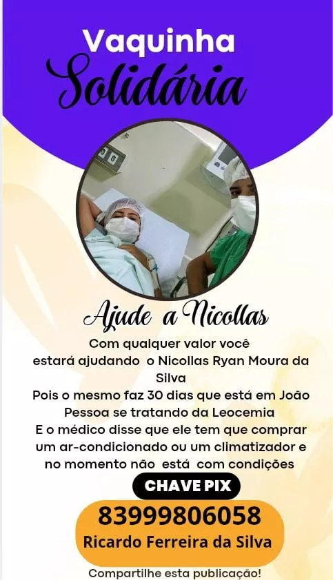 As doações podem ser feitas via Pix: (83) 99980-6058, em nome de Ricardo Ferreira da Silva, pai de Nicollas. Mais informações também podem ser obtidas diretamente com a família pelo mesmo contato.