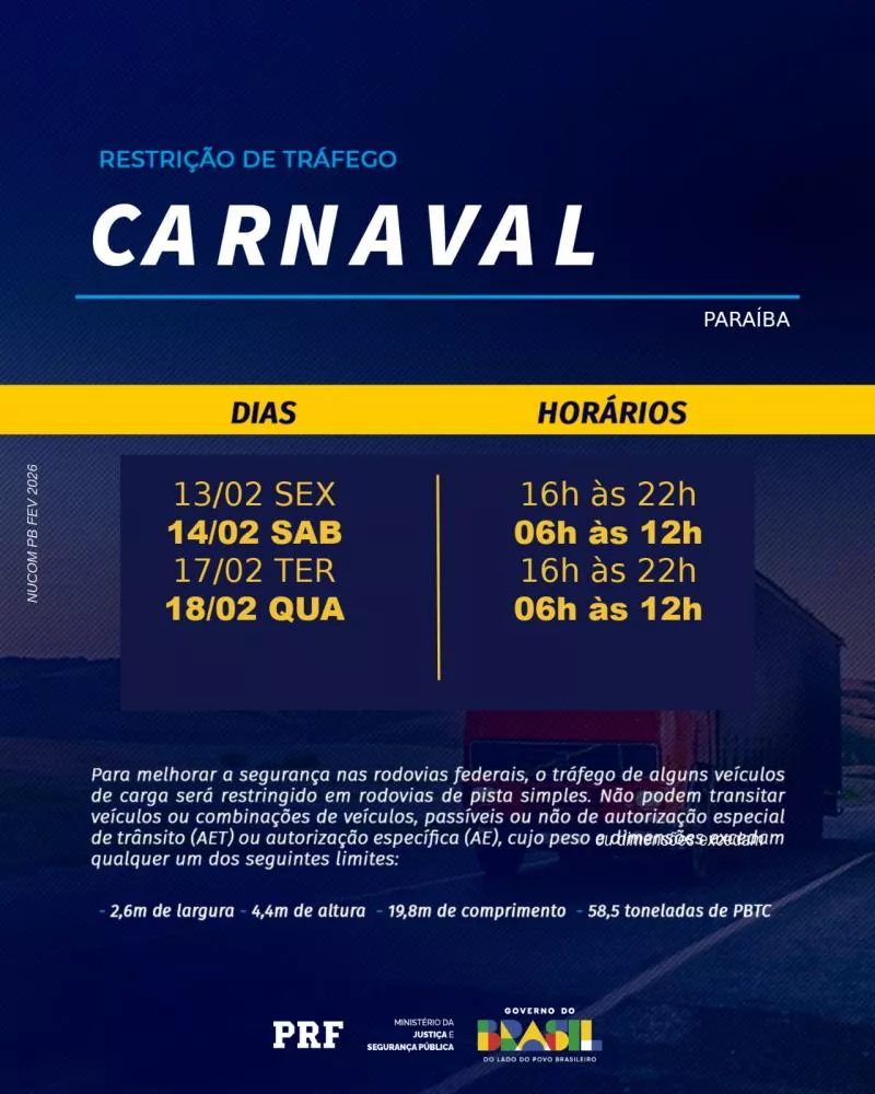 Com o objetivo de reforçar a segurança viária e garantir maior fluidez no trânsito durante o Carnaval 2026, a Polícia Rodoviária Federal (PRF) anunciou novas restrições para o tráfego de veículos de carga com dimensões ou peso excedentes nas rodovias federais da Paraíba. A medida tem foco especial nos trechos de pista simples, onde o risco de acidentes em ultrapassagens é considerado mais elevado.